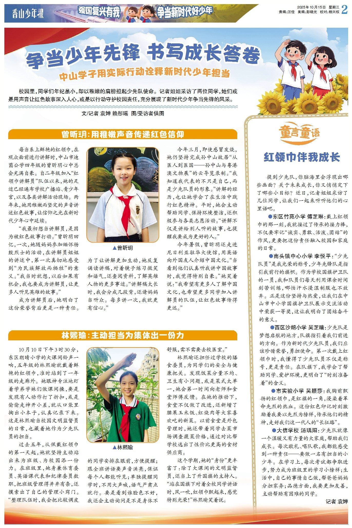 校園里,同學(xué)們年紀(jì)雖小,卻以稚嫩的肩膀擔(dān)起少先隊(duì)使命。記者姐姐采訪了兩位同學(xué),她們或是用聲音讓紅色故事深入人心,或是以行動(dòng)守護(hù)校園責(zé)任,充分展現(xiàn)了新時(shí)代少年?duì)幃?dāng)先鋒的風(fēng)采。(→點(diǎn)擊查看詳情)