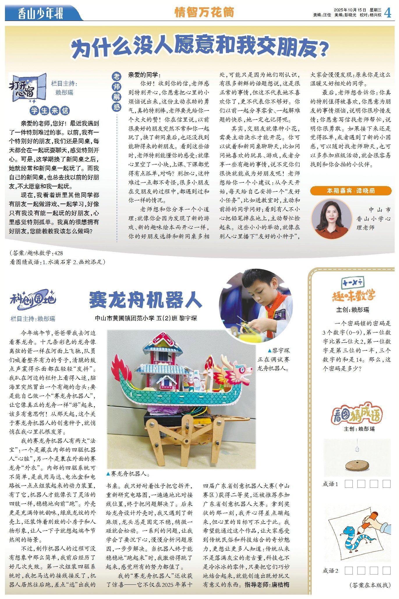在學(xué)校遇到“沒有人愿意和我交朋友”的問題,怎么辦?本期《情智萬花筒》,老師針對(duì)同學(xué)的這一困惑給出了暖心解答。在科創(chuàng)園地欄目,同學(xué)分享了“賽龍舟機(jī)器人”誕生記,展現(xiàn)了傳統(tǒng)文化與科技的碰撞。(→點(diǎn)擊查看詳情)