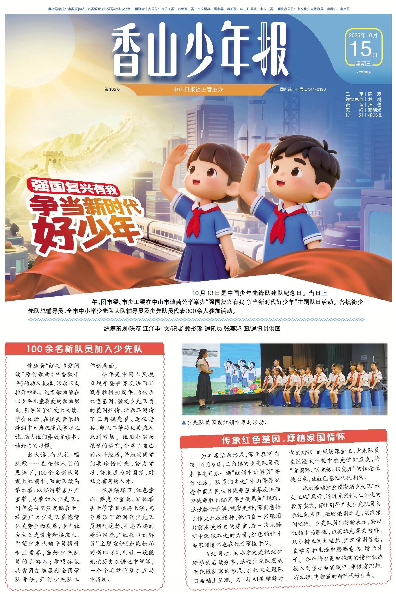 10月13日,“強(qiáng)國(guó)復(fù)興有我”主題隊(duì)日活動(dòng)在中山市迪茵公學(xué)舉行?;顒?dòng)通過新隊(duì)員入隊(duì)、老兵紅色分享、特色展演,并聯(lián)動(dòng)“紅領(lǐng)巾講解員”尋訪之旅以及“AI英雄跨時(shí)空的對(duì)話”等,深化紅色教育,引導(dǎo)少年?duì)幾鲂聲r(shí)代好少年。(→點(diǎn)擊查看詳情)