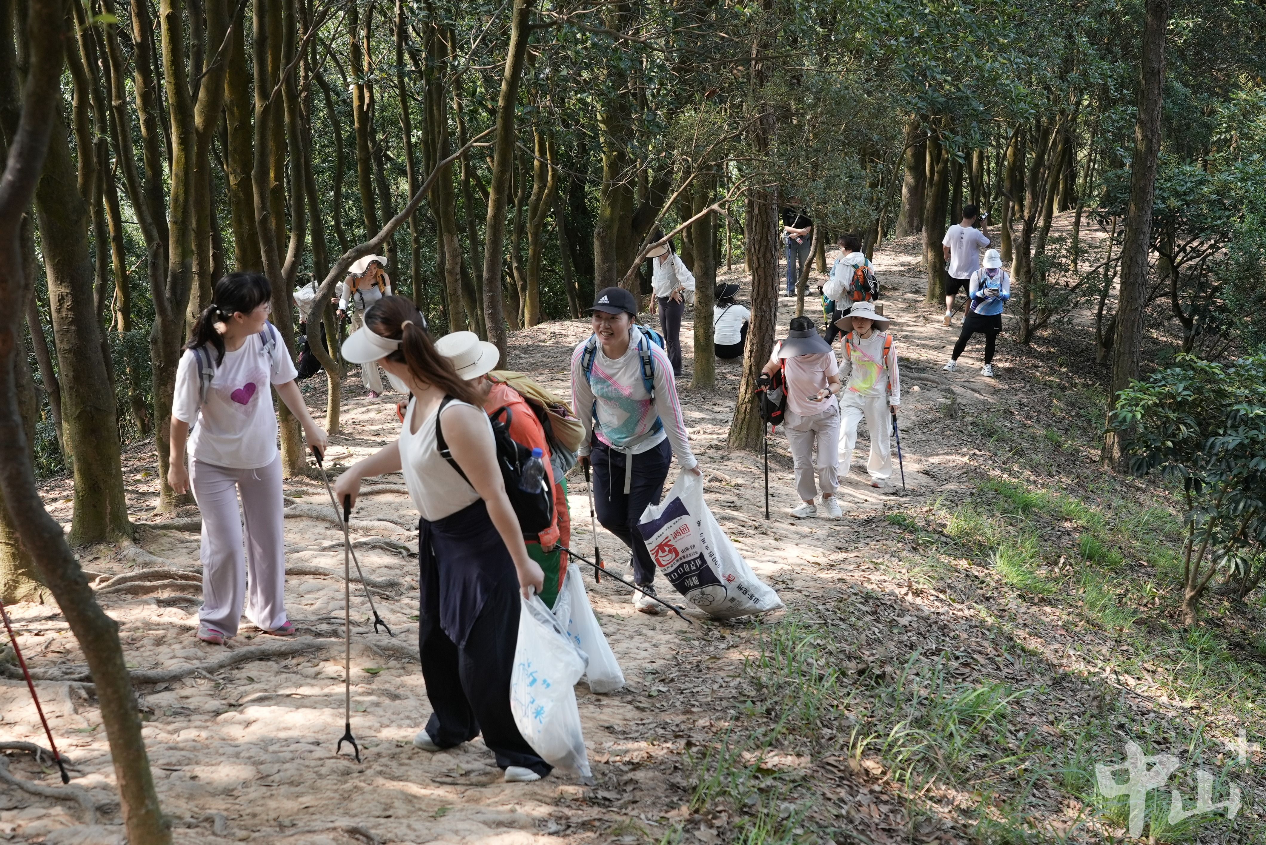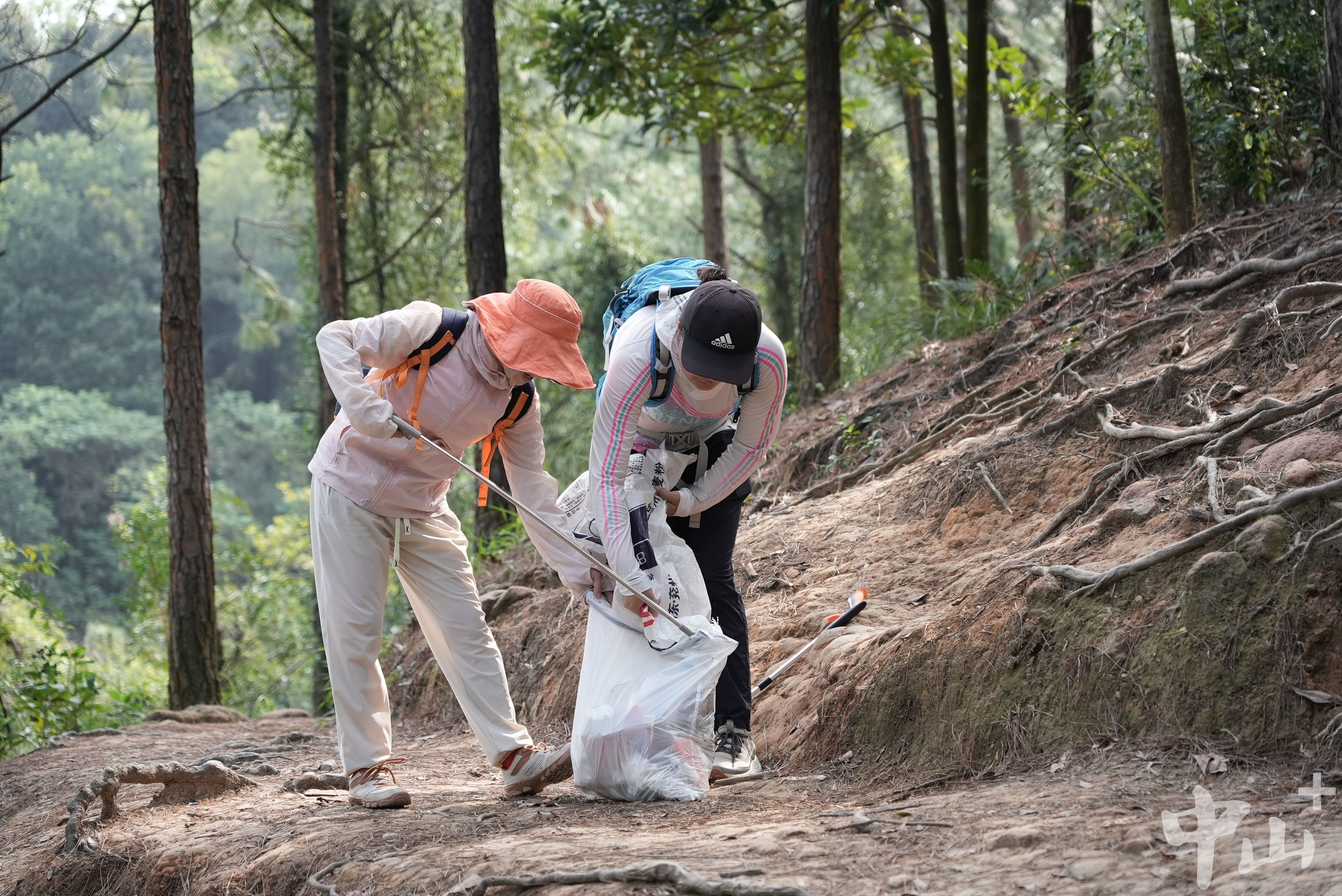 入秋的中山天氣依然熾烈,參與者很快汗?jié)褚律?。“上山帶垃圾不方便,我們都是下山時集中清理,這樣既能保證爬山安全,又能高效拾撿。”丁艷一邊說著,一邊用夾子夾起陡坡處的一個塑料瓶——這個瓶子被遺落在半人高的灌木叢中,稍不注意就會被忽略。
